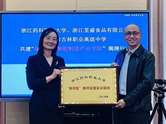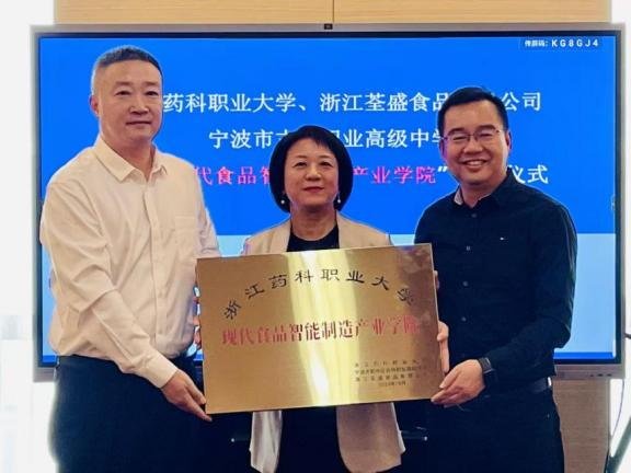 姜宇国、冉秀清、杜浩军共同为“浙江药科职业大学现代食品智能制造产业学院”揭牌,标志着三方合作平台正式落地。